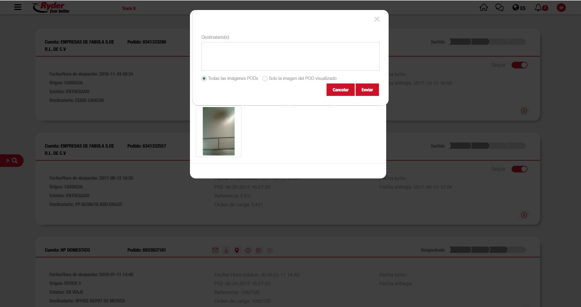 Si el usuario desea compartir por correo electrónico la imagen de POD deberá dar clic en el icono de "Email" y se mostrará pantalla para realizar la captura de los destinatarios.