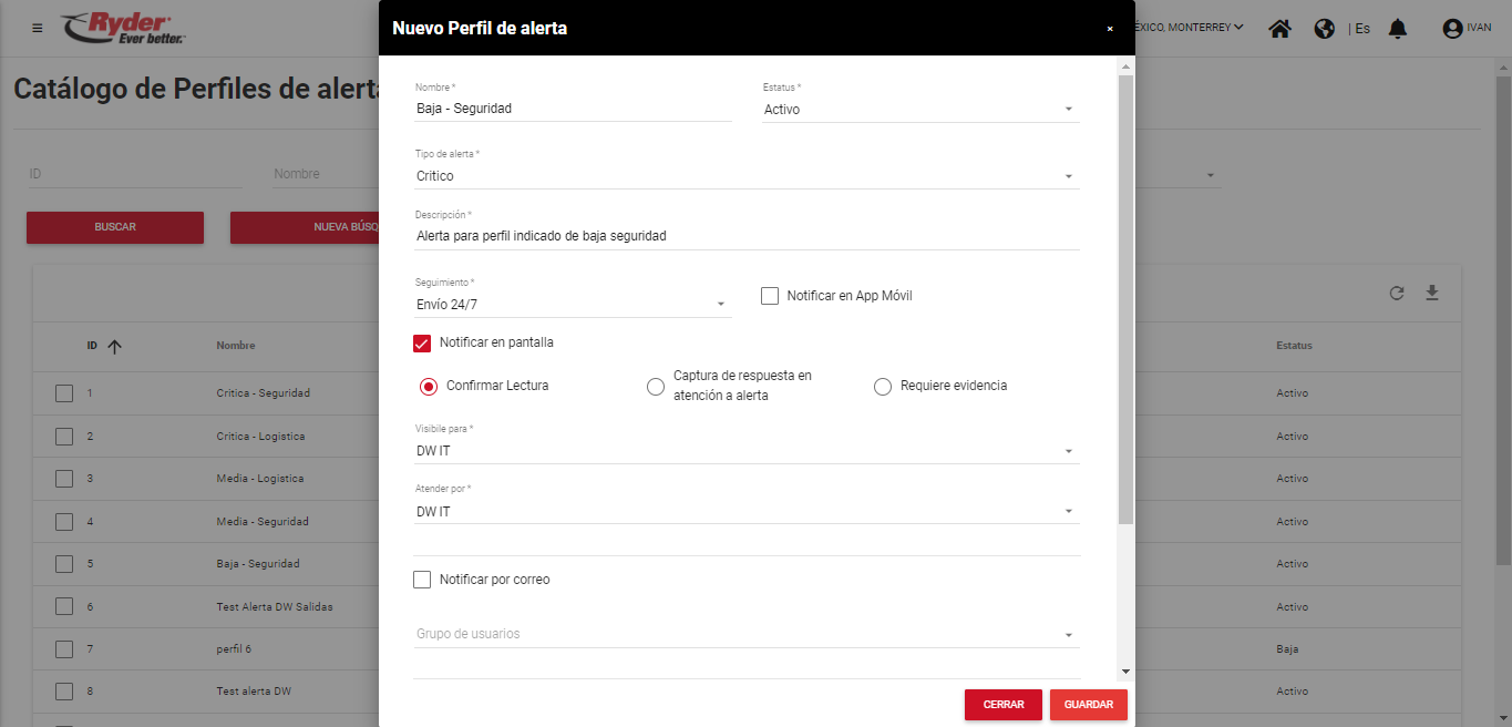 - No se encuentre un perfil de alerta ya registrado con el mismo nombre capturado que se está intentando guardar.