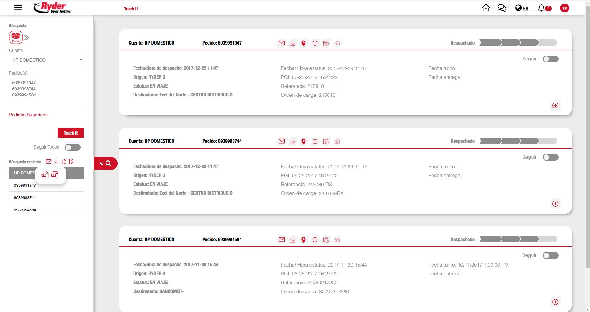 Si el usuario desea descargar los resultados en un archivo de Excel o PDF, deberá dar clic sobre el icono correspondiente y se visualizará el archivo con los resultados de la consulta los cuales el navegador descargará con el método respectivo. Por cada registro se mostrarán los siguientes datos: documento, orden de carga, referencia, CIA, nick, origen, destinatario, destino, fecha turno, fecha salida. fecha entrega y estado.