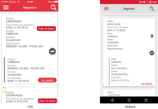 El usuario deberá iniciar sesión y deberá estar posicionado en la pantalla Seguidos. El usuario visualiza el listado de pedidos seguidos en orden alfanumérico descendente con base a la fecha de despacho.