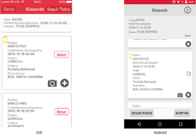 - Si el usuario no sigue a ningún pedido, se mostrará la pantalla Búsqueda con la opción pedido asignada por default.