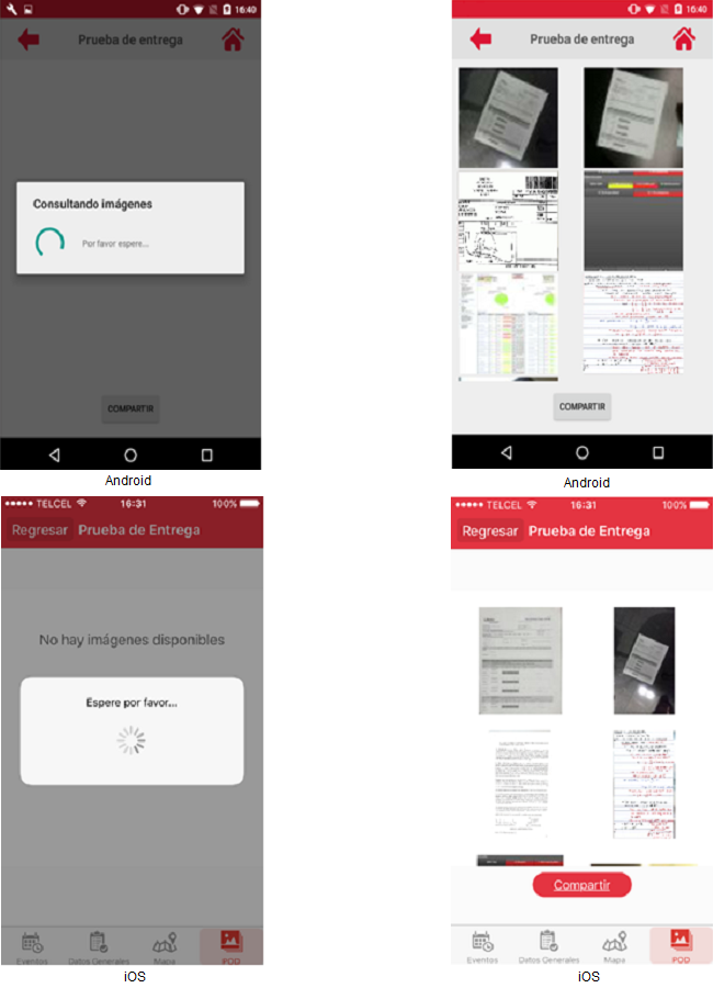 - El usuario deberá presionar el icono “Cámara” y esta acción mostrará el dialogo de descarga y posteriormente la pantalla Prueba de entrega. Si el usuario desea tener actualizadas las imágenes podrá actualizar dicha pantalla deslizándose hacia abajo, mostrándose un espiral de carga y como resultado las imágenes actualizadas.