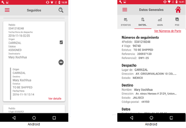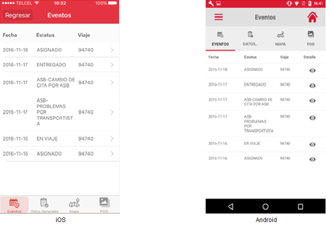 - El usuario deberá presionar el pedido de su interés y esta acción mostrará la pantalla Eventos, donde se mostrarán los eventos del pedido en orden descendente con base a la fecha.