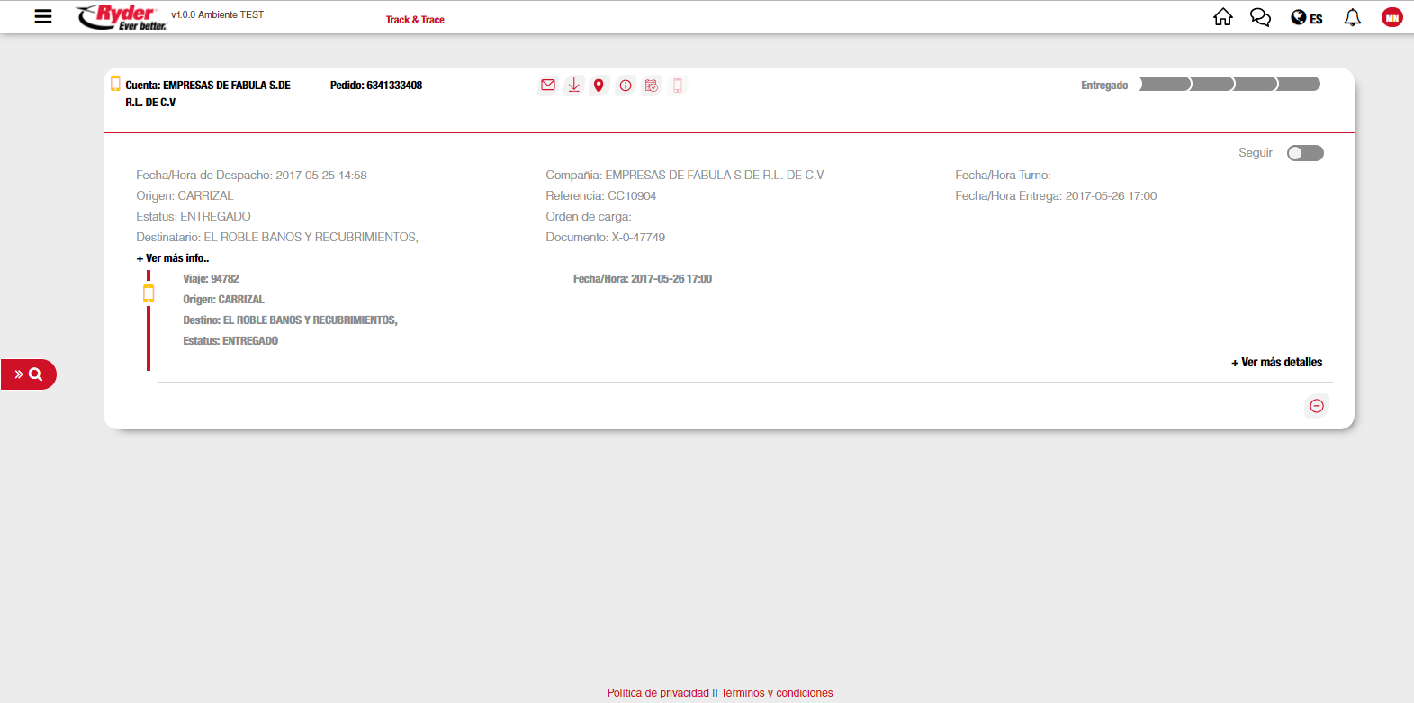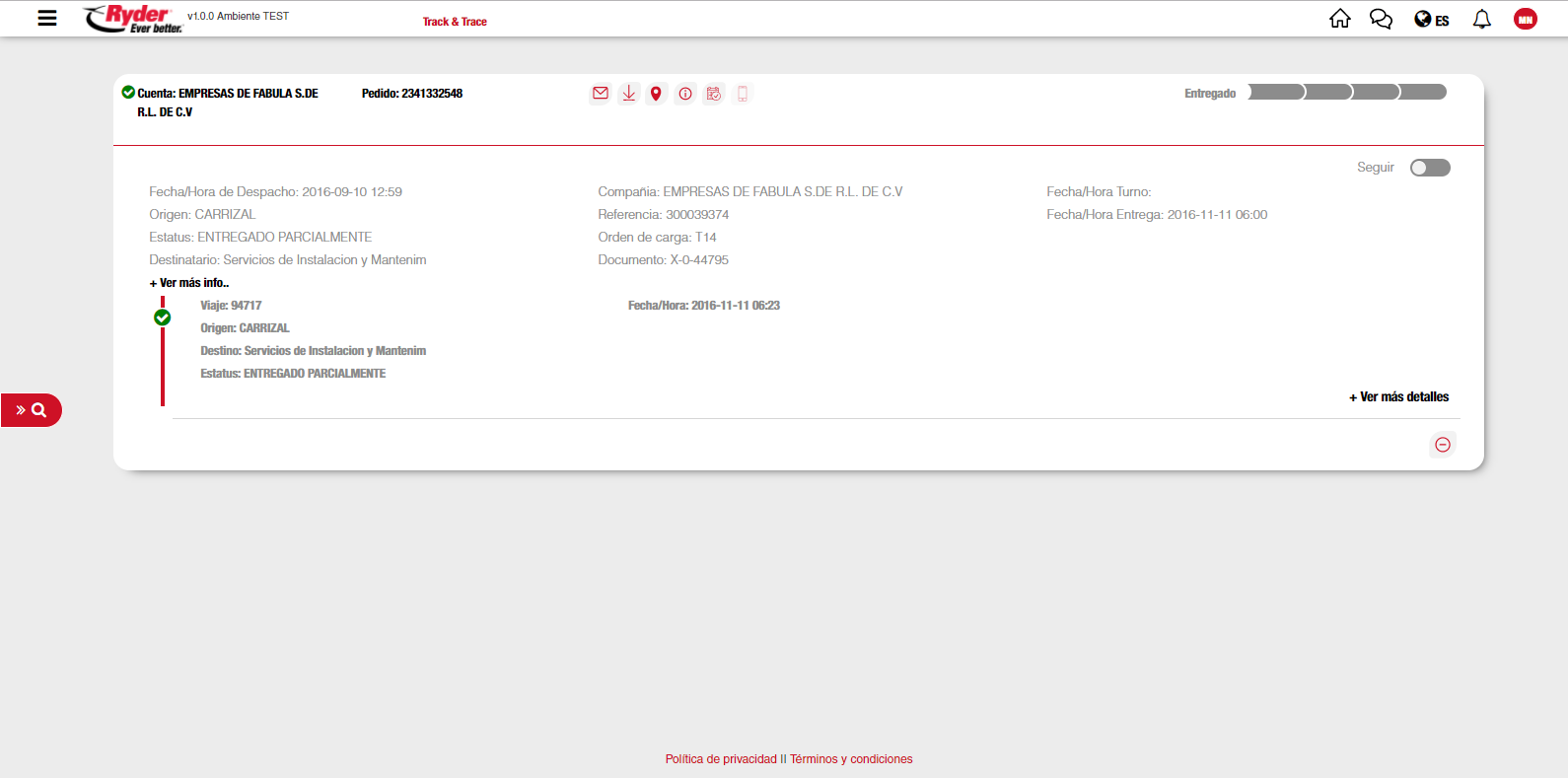 Si el pedido cuenta con estatus "Entregado" y su primer viaje ha sido "Rendido" pero su último viaje no, se mostrará el check mark verde en el primer viaje, icono de celular amarillo en el último viaje y en el pedido.