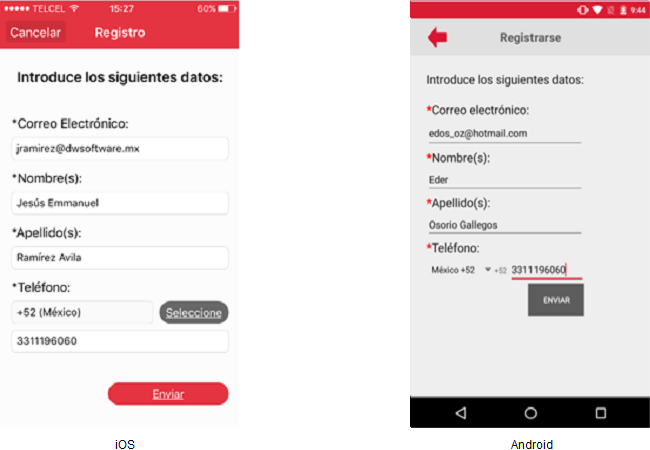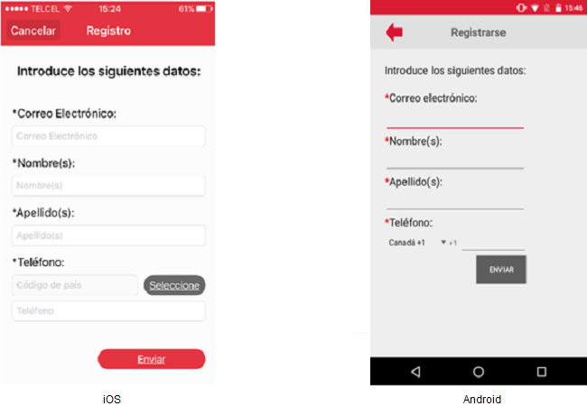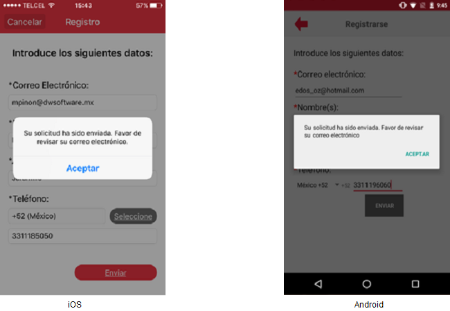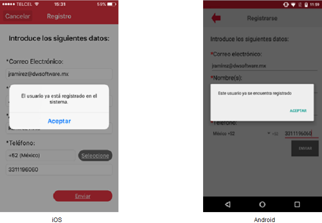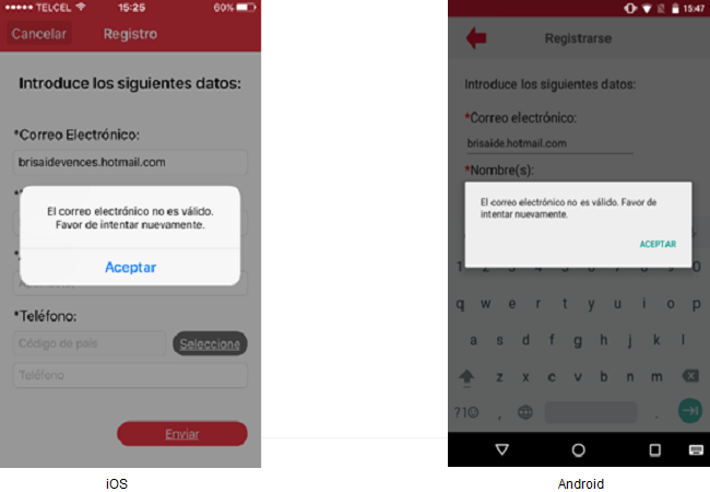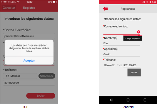 ElAl usuariono deberácumplirse presionarla elvalidación botón [Enviar] y esta acción validará que losde campos de carácter obligatorio cuenten con datos. Si al menos un campo de carácter obligatorio no cuenta con datos entoncesobligatorios, se resaltará el o los campos en blanco asignándoles un icono del signo de admiración en color rojo además de un mensaje rojo, y en el iPhone se mostrará el siguientemensaje mensaje"Los campos con asterisco (*) son de carácter obligatorio. Favor de capturarlos" que una vez aceptado mostrará los campos faltantes de datos en color rojo.