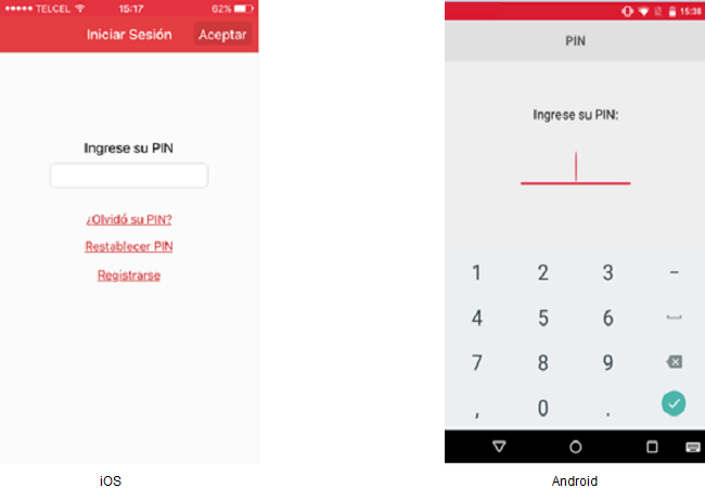 O el usuario deberá presionar el botón [Aceptar] y está acción hace que se la aplicación evalúe si es la primera vez que se está ingresando a la aplicación. Al no ser la primera vez que se está ingresando, se mostrará la pantalla donde se solicita la captura del PIN.