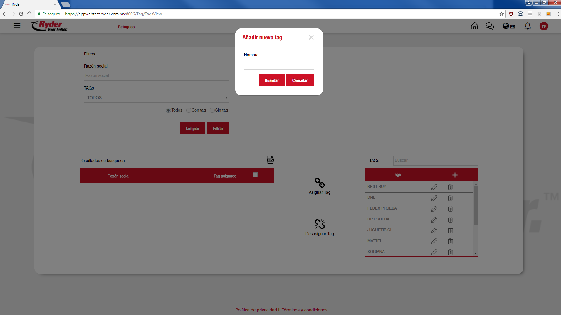 Al dar clic en el icono "+" se mostrará una pantalla que permitirá al usuario, asignarle un nombre al nuevo tag que se desea crear.