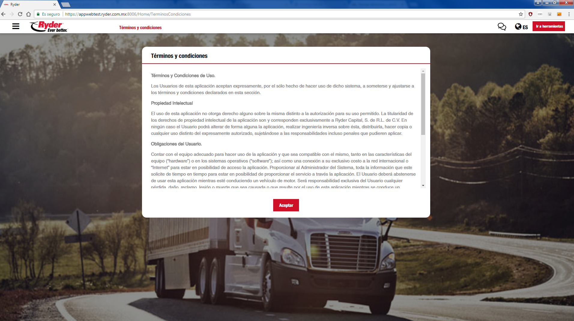Una vez que el usuario ha ingresado desde cualquier punto de los anteriores se mostrará la pantalla que contiene los "Términos y condiciones".