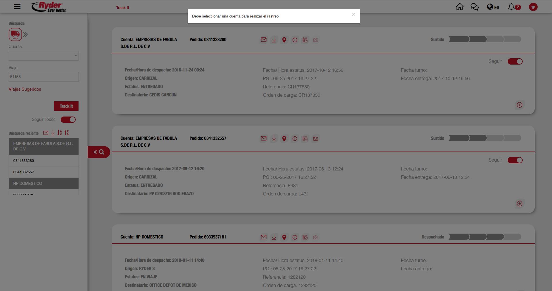 - Si el usuario da clic en el botón [Track it] sin haber elegido una cuenta y/o no existe una búsqueda anterior, se mostrará el siguiente mensaje: "Debe seleccionar una cuenta para realizar el rastreo", el mensaje permanecerá visible por 3 segundos.