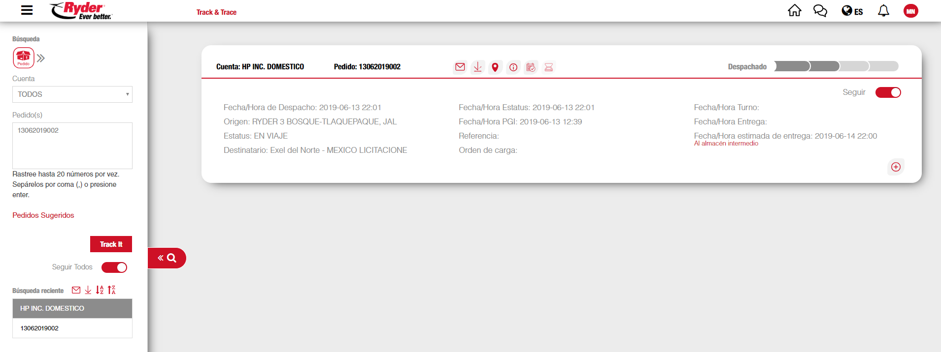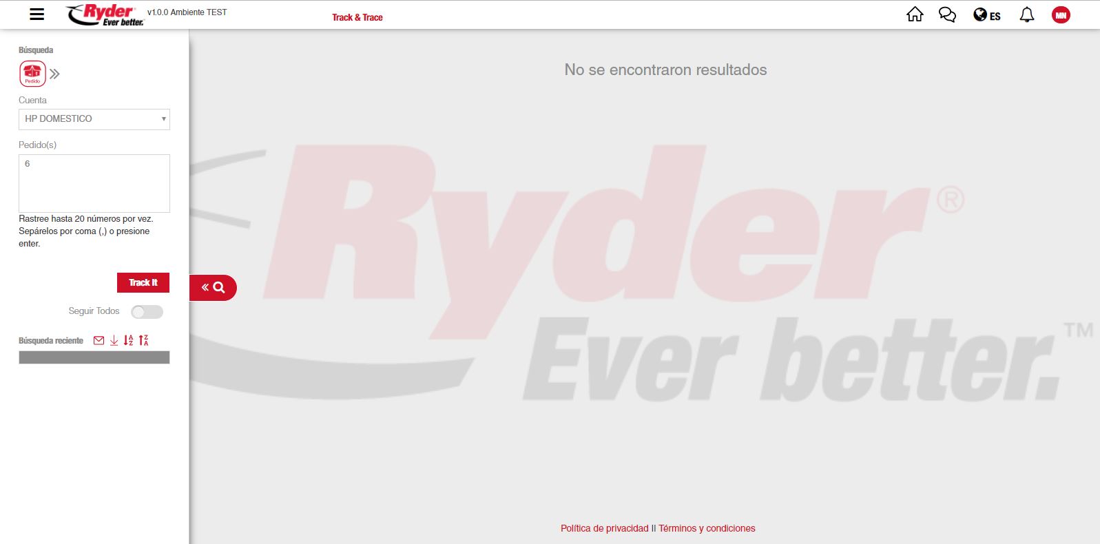 El usuario deberá dar clic en el botón [Track it] y se mostrarán los resultados de la búsqueda. Los resultados de la consulta también se mostrarán en la sección "Búsqueda Reciente", agrupados por cuenta sobre el menú lateral.