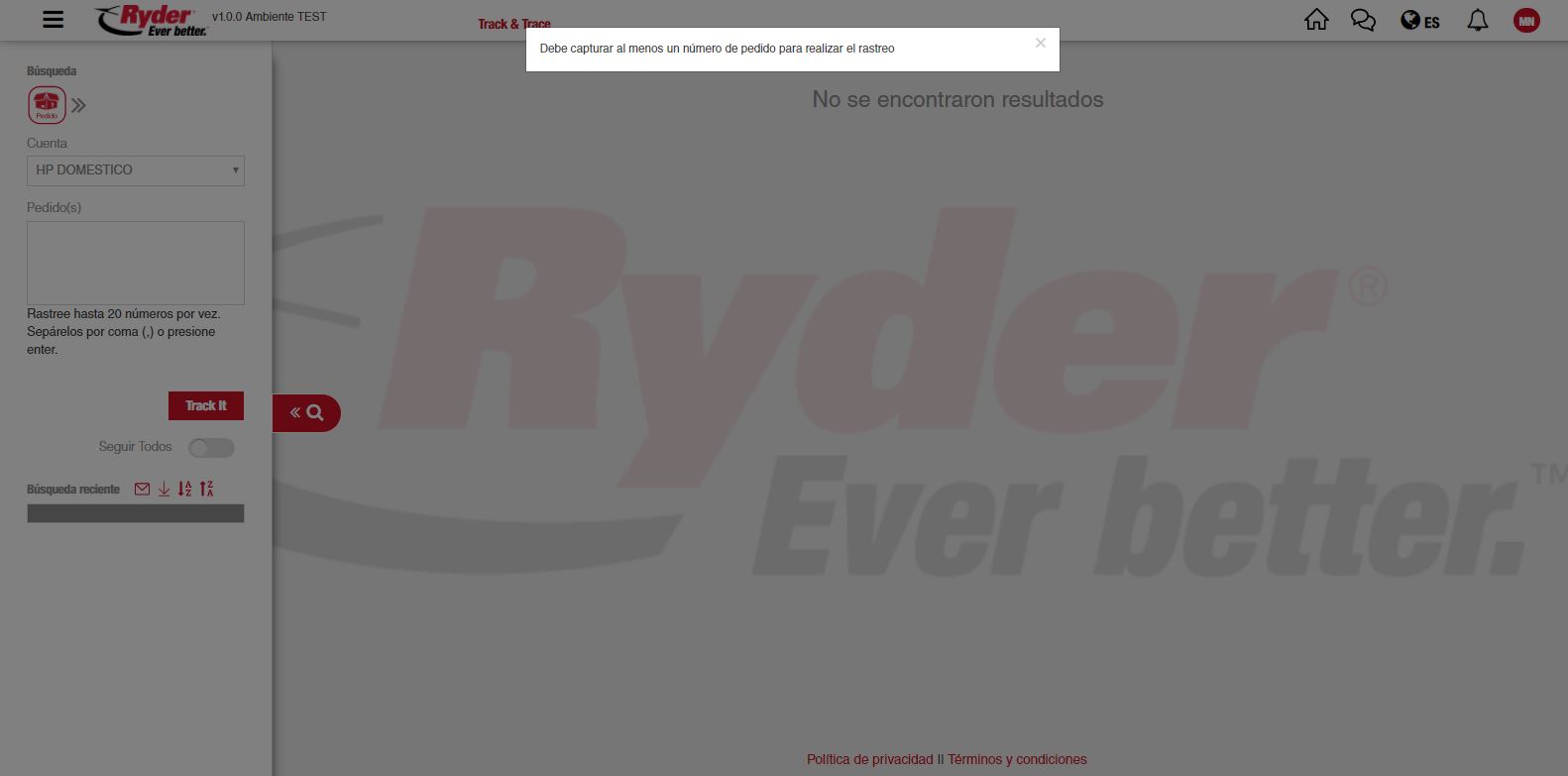 Si el usuario no realiza captura de números de pedidos y da clic en el botón [Track it] con los campos vacíos, se mostrará el siguiente mensaje: "Debe capturar al menos un número de pedido para realizar el rastreo", el mensaje permanecerá visible por 3 segundos.