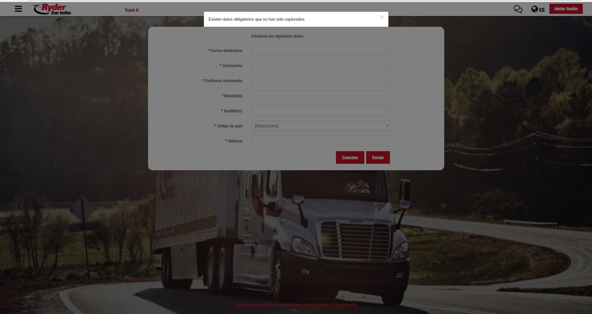 - El usuario da clic sobre el botón [Enviar] dejando datos marcados como obligatorios sin capturar, se mostrará el siguiente mensaje de alerta: "Existen datos obligatorios que no han sido capturados" el cual desaparecerá automáticamente, el usuario deberá realizar la captura de la información faltante para concluir el proceso.