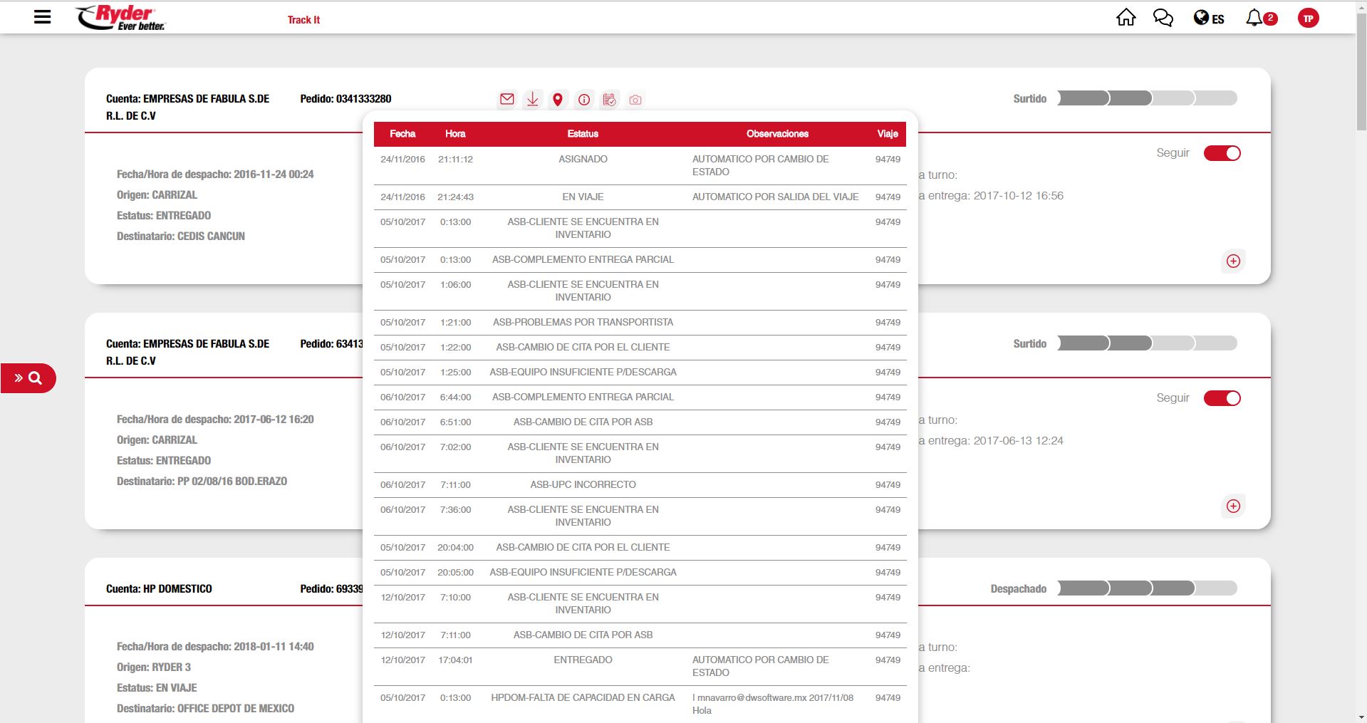 Se mostrará la lista de eventos asociados al pedido y en caso de que la lista supere el tamaño de la ventana el usuario deberá hacer scroll hacia la parte inferior de la página.