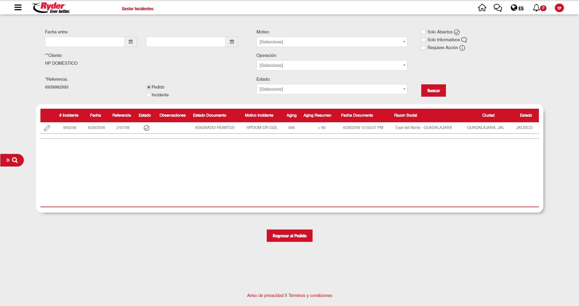 Se mostrará la lista de incidentes asociados al embarque y en caso de que la lista supere el tamaño de la ventana, el usuario deberá hacer scroll hacia la parte inferior de la página.
