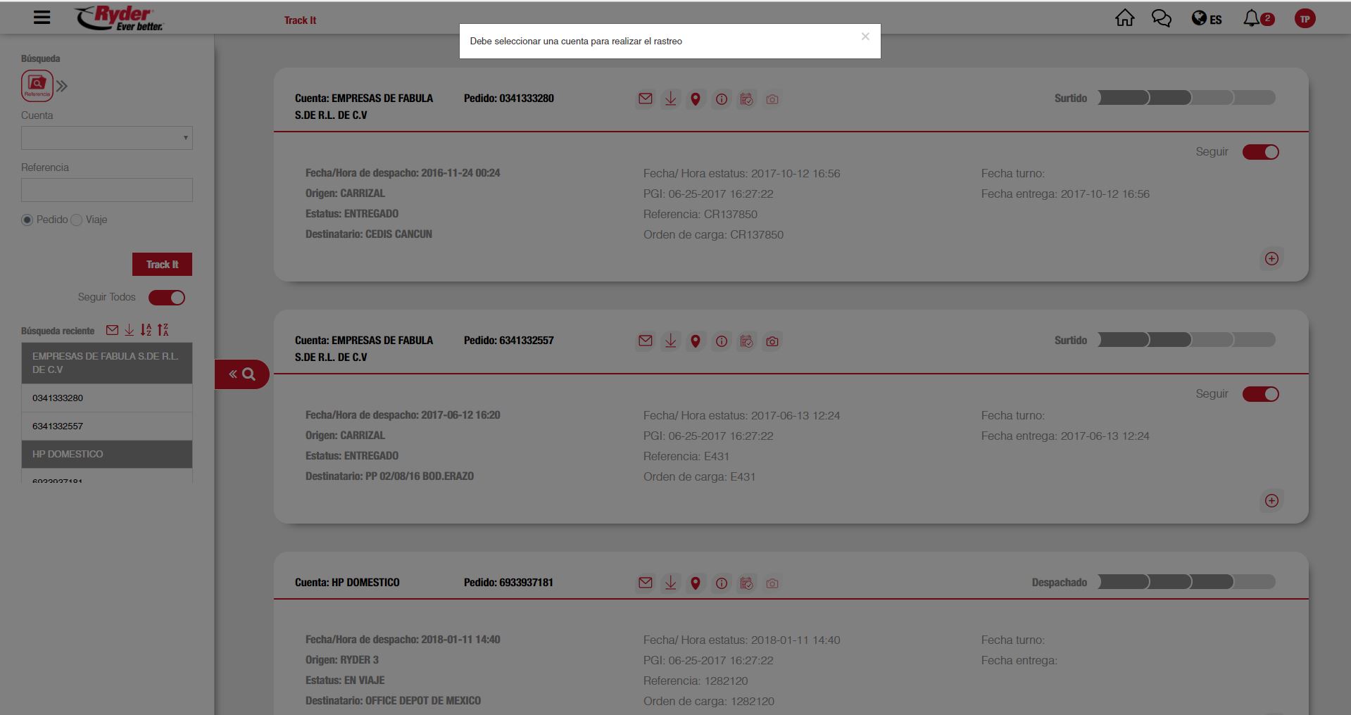 Si el usuario da clic en el botón [Track it] sin haber elegido una cuenta y/o no existe una búsqueda anterior, se mostrará el siguiente mensaje: "Debe seleccionar una cuenta para realizar el rastreo", el mensaje permanecerá visible por 3 segundos.
