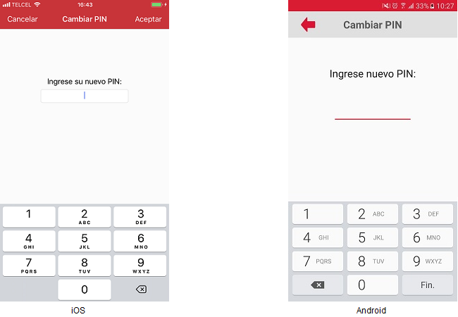 Si no es la primera vez que el usuario ingresa y no tiene configurado el Touch ID se muestra la pantalla para captura del PIN.
