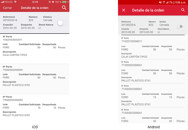El usuario puede consultar las líneas/números de parte de cualquiera de las órdenes, seleccionando el registro de interés y la aplicación muestra la lista de números de parte asociados a la orden seleccionada.