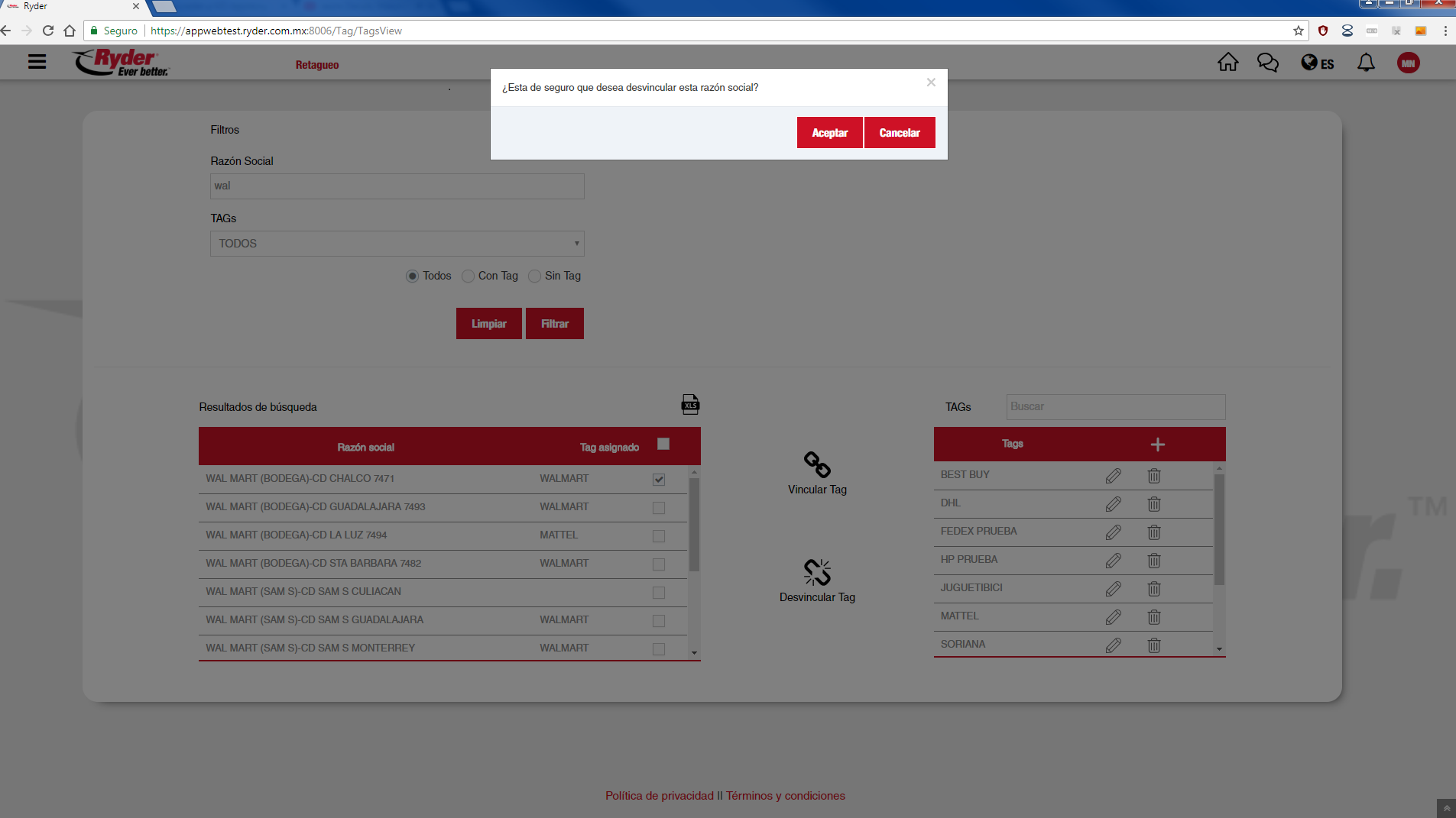 El usuario podrá desvincular uno o varios tags al seleccionar la o las razones sociales a desvincular y hacer clic que clic en el botón [Desvincular Tag]Tag], visualizándose un mensaje con las opciones "Si" para confirmar la acción de desvincular y "No" para que el usuario cancele la acción de desvincular.