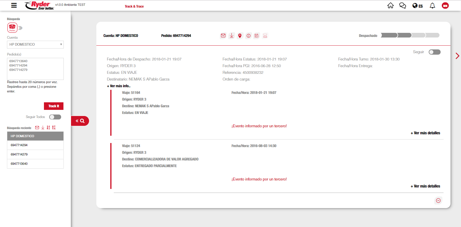 Al encontrarse el usuario posicionado sobre la información detallada del pedido y en caso de que cuente con envío por paquetería en su último segmento, éste se mostrará posicionado al inicio de la lista de los viajes mostrando información del último evento registrado. En dicho segmento se mostrará la siguiente leyenda: ¡Evento informado por un tercero!.