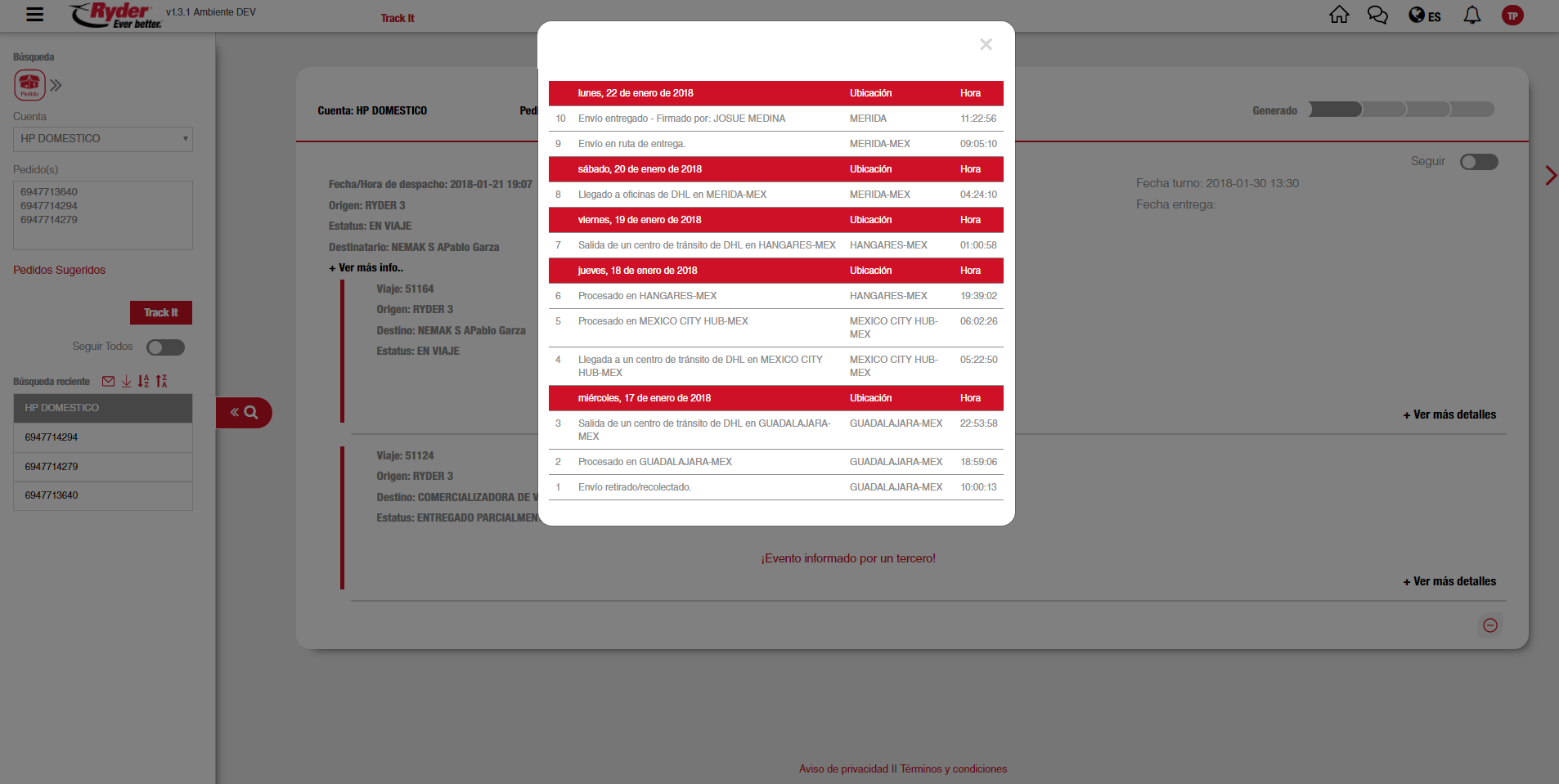 Se visualizará una pantalla que contendrá la información detallada de los eventos proporcionados por DHL en relación con el pedido. Si el usuario desea cerrar la pantalla, deberá dar clic sobre el icono "X" y se mostrará la pantalla de información del pedido, segmento DHL y viajes.