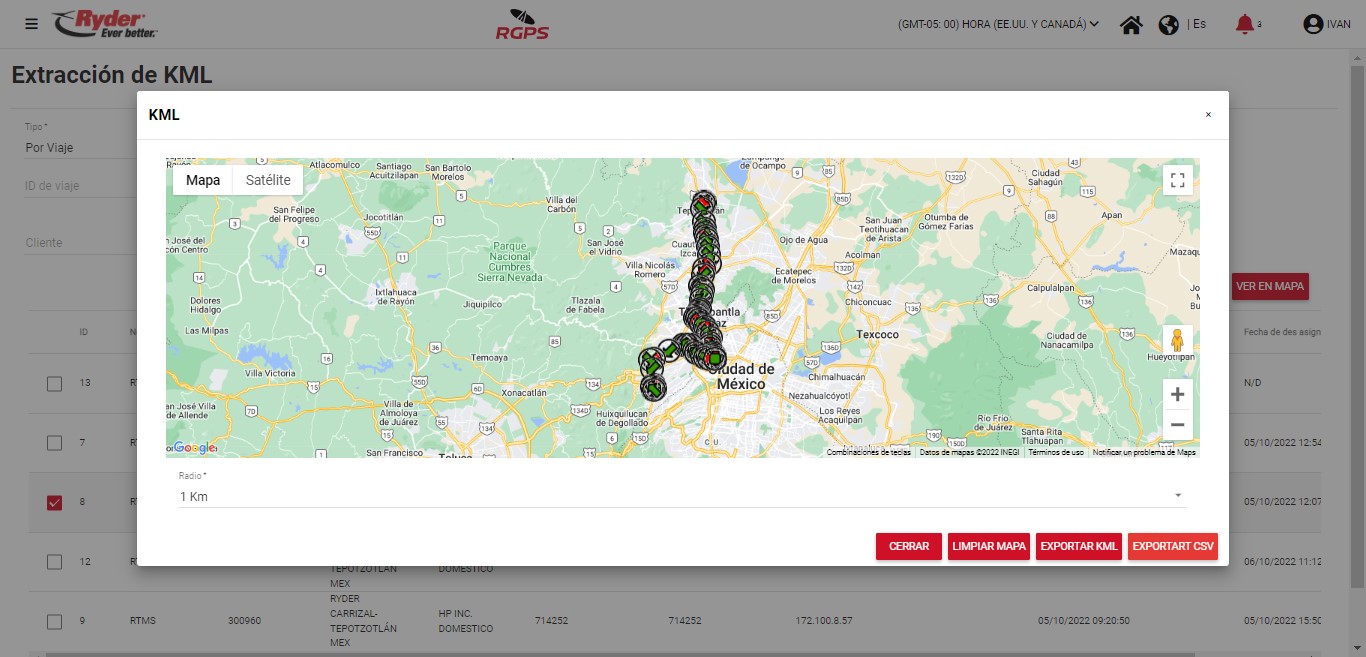 - Fecha inicio. Permitirá realizar la selección de una fecha/hora para la búsqueda mediante las coincidencias con la cual se guardó el registro de recorrido de KML al iniciar un viaje. Por default se encontrará seleccionada la fecha del día en curso.