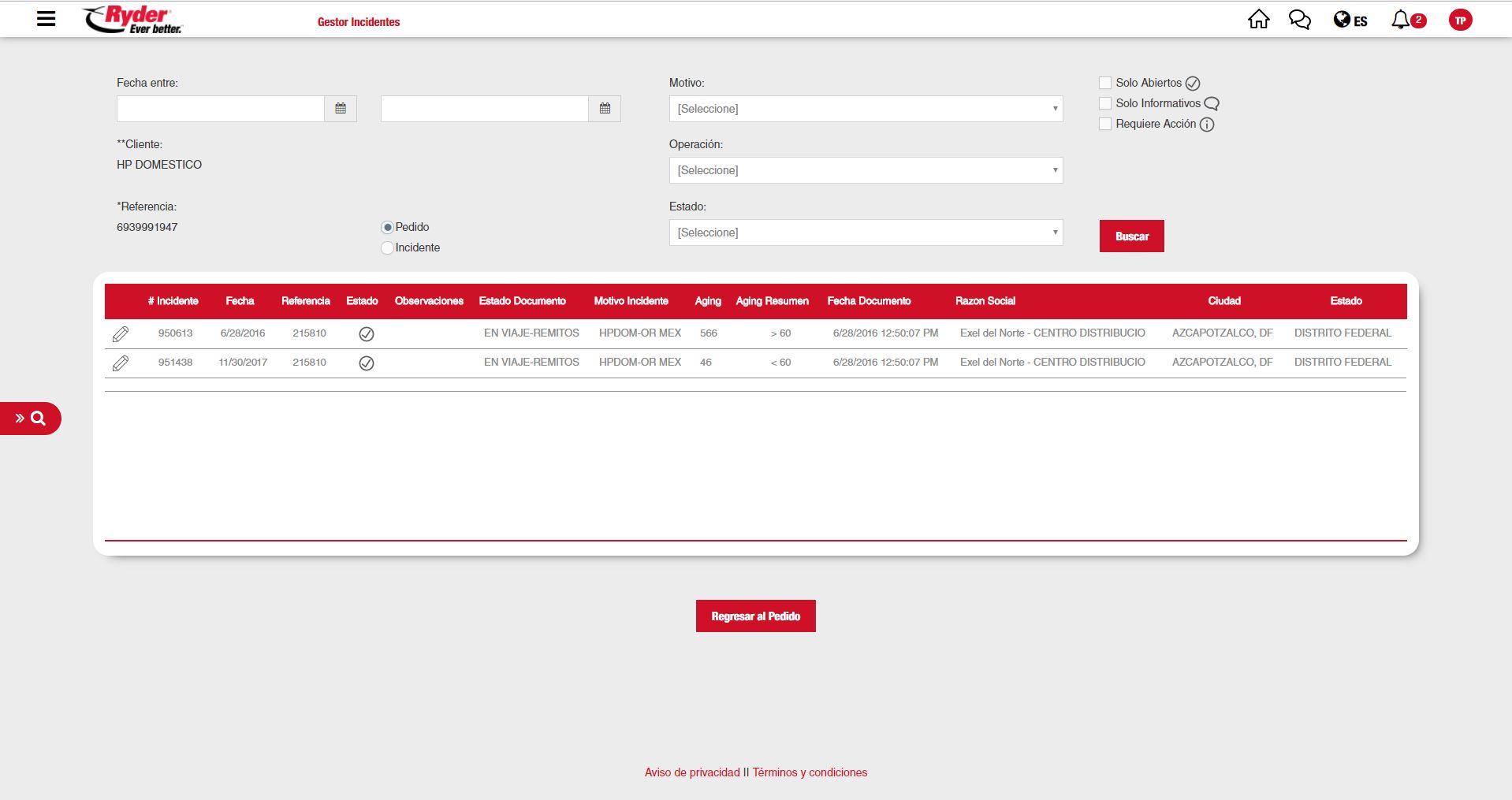 ElDentro del Gestor de incidentes, el usuario alpodrá encontrarseactualizar posicionadoel sobreincidente loscapturando resultadosobservaciones dey/o búsquedacerrando deel pedidosincidente deberá(siempre darque tenga el permiso para hacerlo y el incidente no sea del tipo Informativo Ryder) haciendo clic sobreen el icono "Información"de que se encuentra al lado derecho del icono "Ubicación" en la parte superior[Edición] de cada unoregistro del listado de los resultados.incidentes.