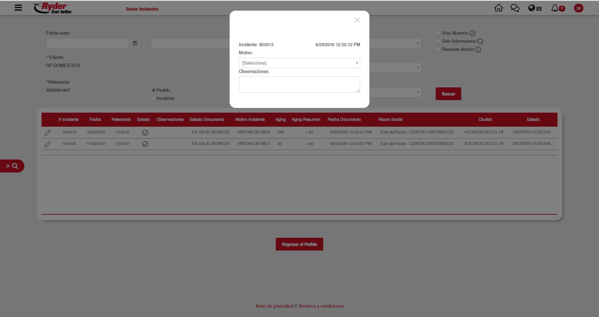 El sistema enviará la información al RTMS que la procesará conforme a las reglas definidas. El sistema cerrará el iconorecuadro "Editar".y actualizará el listado para mostrar la nueva información con los nuevos estatus. El usuario deberápodrá dareditar clicotro sobreincidente elo campoactualizar "Motivo"su y se desplegará una lista de opciones de las cuales deberá realizar la selección de un motivo. Posteriormente deberá realizar la captura de texto sobre el campo "Observaciones".búsqueda.