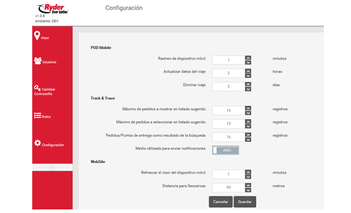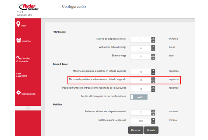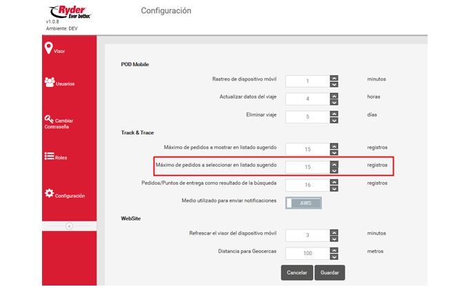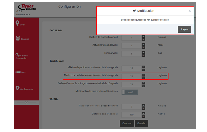 El usuario deberá seleccionar o capturar la cantidad máxima de registros de pedidos que el usuario de la aplicación podrá seleccionar en listado sugerido de la aplicación Ryder Track & Trace y después deberá dar clic en el botón [Guardar] y esta acción muestra la siguiente notificación:
