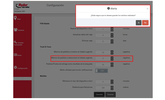 O el usuario deberá seleccionar o capturar la cantidad máxima de registros de pedidos que el usuario de la aplicación podrá seleccionar en listado sugerido de la aplicación Ryder Track & Trace y después deberá dar clic en el botón [Cancelar] y esta acción muestra la siguiente alerta: