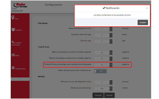 El usuario deberá seleccionar o capturar la cantidad de registros de pedidos y puntos de entrega que el usuario de la aplicación podrá visualizar como resultado de la búsqueda en la aplicación Ryder Track & Trace y después deberá dar clic en el botón [Guardar] y esta acción muestra la siguiente notificación:
