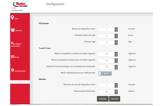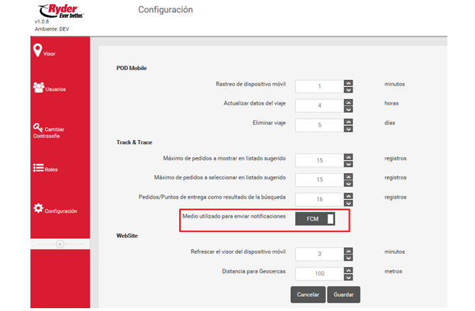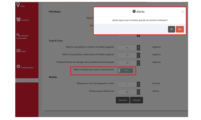 O el usuario deberá dar clic en el botón para indicar el medio que desea utilizar para el envío de notificaciones, ya sea FCM (Firebase Cloud Messaging) o AWS (Amazon Web Services) y dar clic en el botón [Cancelar] y esta acción muestra la siguiente alerta: