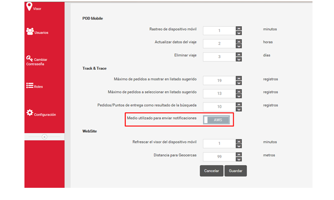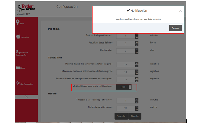 El usuario deberá dar clic en el botón para indicar el medio que desea utilizar para el envío de notificaciones, ya sea FCM (Firebase Cloud Messaging) o AWS (Amazon Web Services) y dar clic en el botón [Guardar] y se mostrará la siguiente notificación: