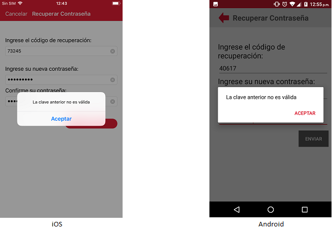 En caso que el usuario no capture el código de recuperación correctamente la aplicación mostrará el mensaje "La clave anterior no es válida"