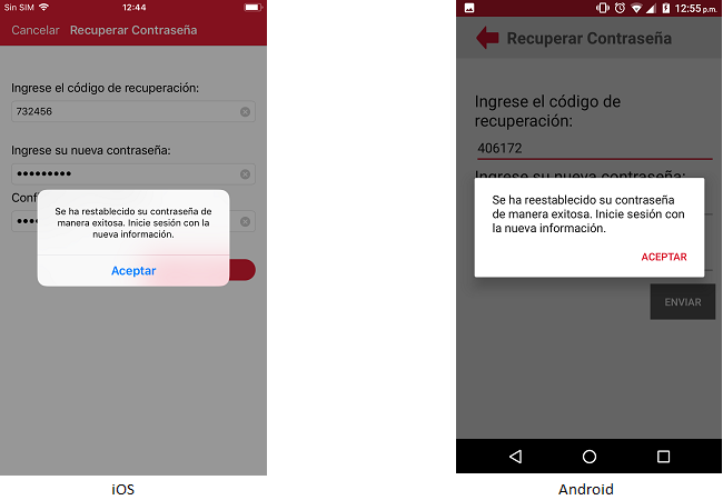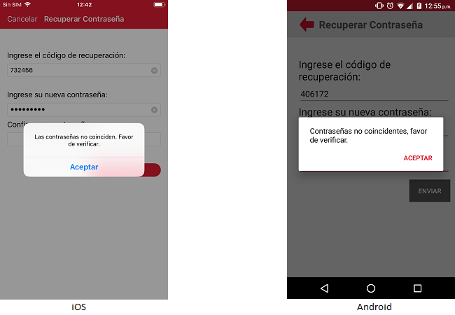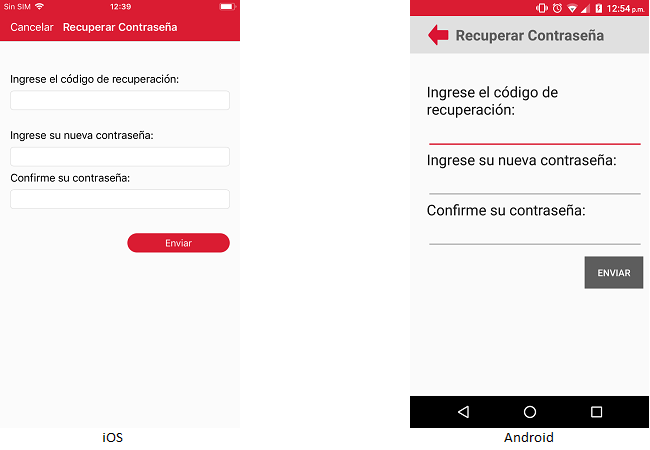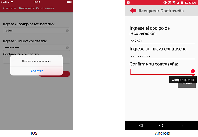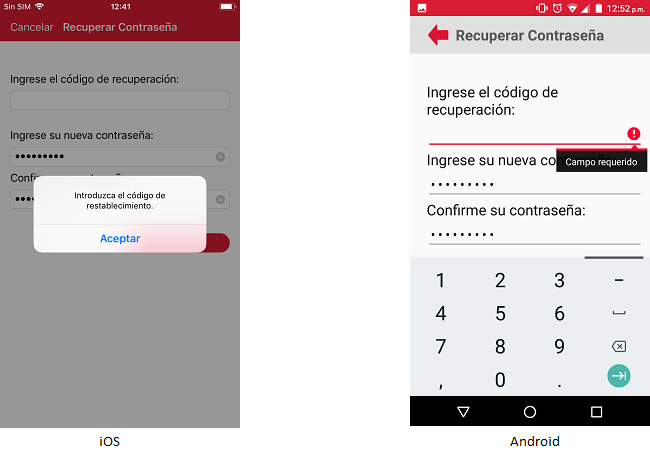 El usuario tendrá que capturar el código que se le proporciono. En caso que el usuario no capture el código de recuperación la aplicación en el caso del iOS, se mostrará el mensaje "Introduzca el código de restablecimiento" y en el caso de Android, se mostrará el campo en rojo con un mensaje de campo requerido.
