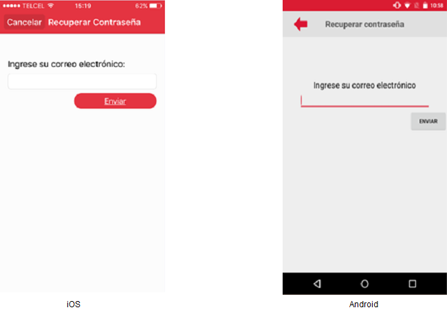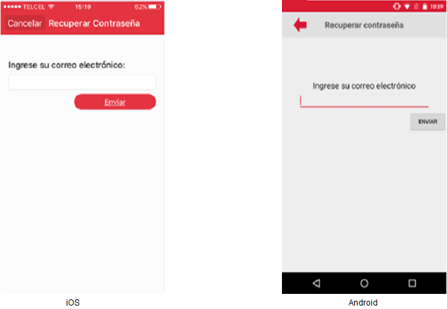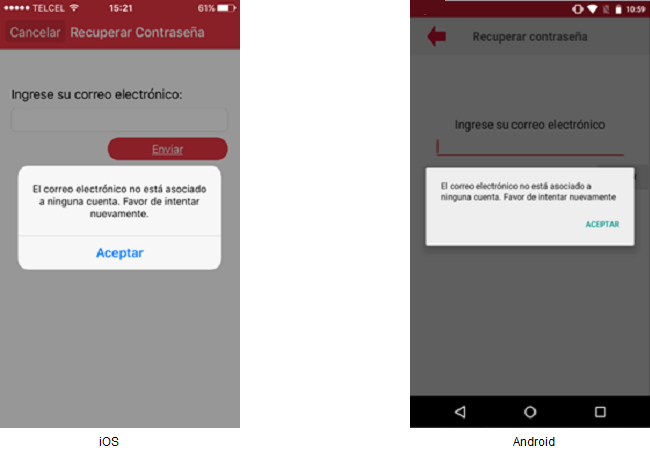 SI el usuario quiere cancelar el ingreso del correo electrónico para restablecer su contraseña, deberá presionar el botón de [Regresar] en caso del Android o [Cancelar] en caso del iOS, visualizándose la pantalla "Inicio de Sesión".