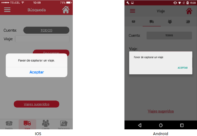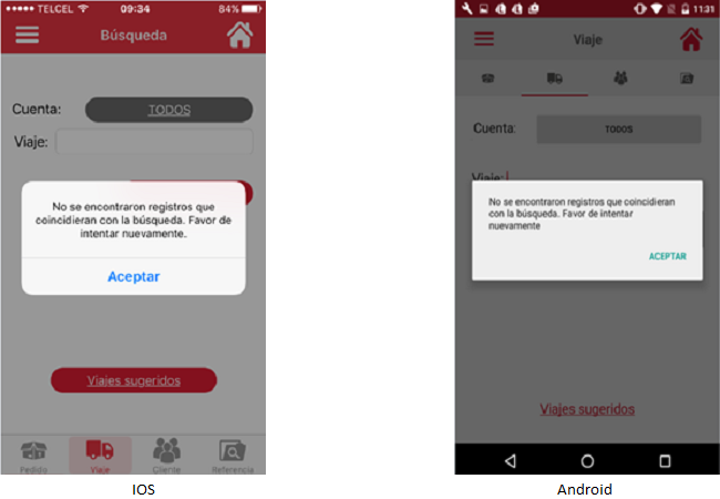 El usuario deberá aceptar el mensaje y esta acción mostrará la pantalla "Búsqueda", con la opción de "Búsqueda por Viaje" con el dato "Cuenta" cuyo valor es la última cuenta seleccionada además de la opción de ingresar viaje en blanco lista para una nueva captura. El usuario podrá ingresar de nuevo al listado de viajes sugeridos.