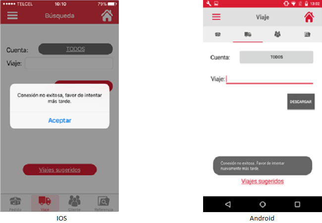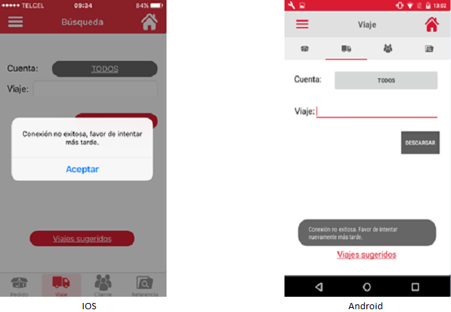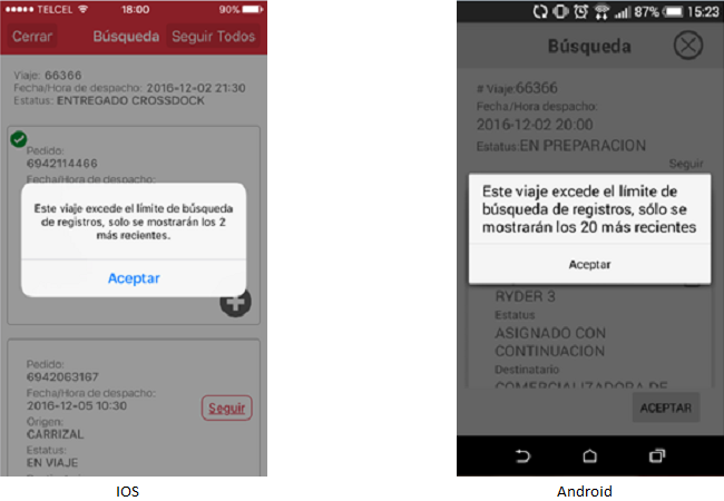 Al completarse la descarga, la aplicación validará si la cantidad de pedidos contenidos en el viaje es mayor a la cantidad permitida. La aplicación mostrará el mensaje". Este viaje excede el limite de búsqueda de registros, solo se mostrarán los 2 más recientes".