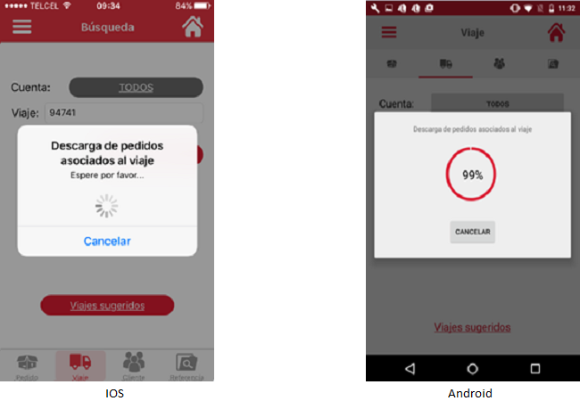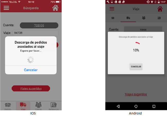 El usuario deberá esperar a contar con conexión a internet e intentar nuevamente la consulta y se validará que exista el viaje, al existir se mostrará la siguiente pantalla de descarga, donde se indica el porcentaje de avance. El usuario podrá cancelar la descarga presionando el botón [Cancelar].