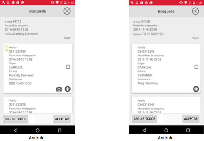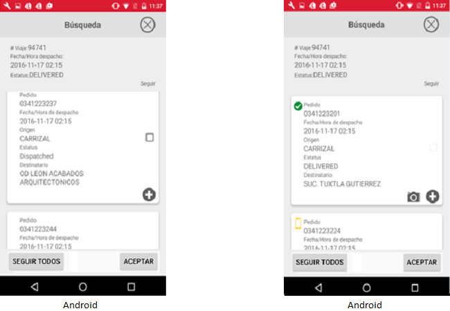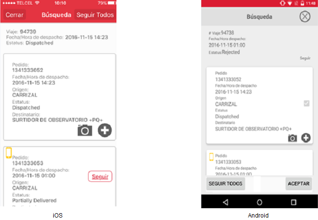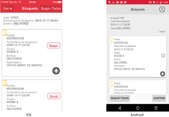 • Si el usuario desea seguir a todos los pedidos sugeridos deberá presionar el botón [Seguir Todos]. El usuario podrá salir de la pantalla donde se visualiza el detalle de los pedidos dando clic en el icono “Cerrar” en Android o presionando el botón [Cerrar] en el iPhone.