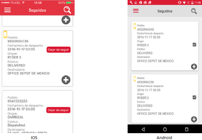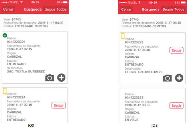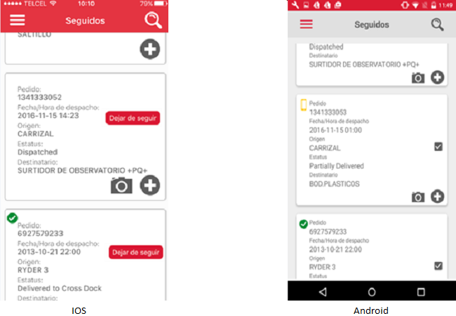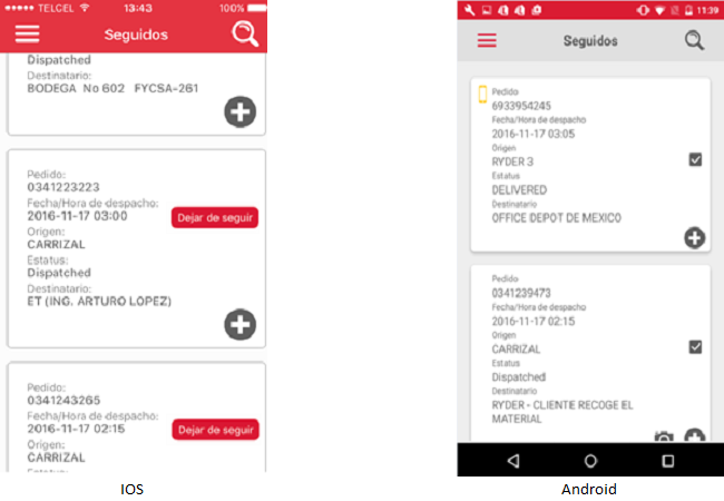Una vez realizada cualquiera de las acciones anteriores, mostrarán como resultado la pantalla "Seguidos" que contiene la lista de pedidos seguidos (ya seguidos con anterioridad y los nuevos) por el usuario en orden alfanumérico descendente con base a la fecha de despacho.