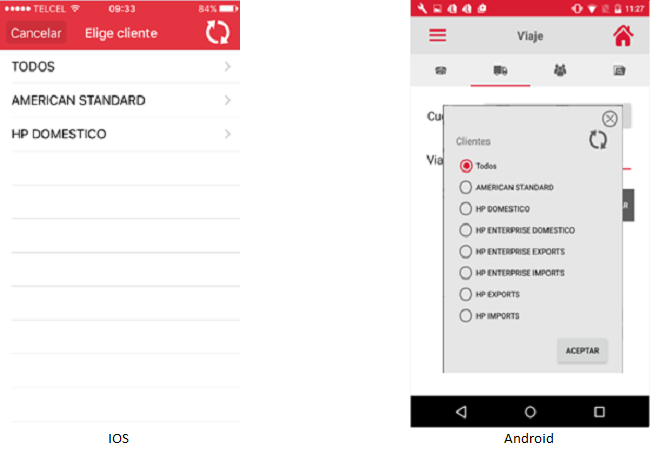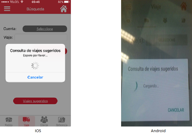 Los viajes sugeridos cuyos pedidos relacionados con el viaje aún no son seguidos, se mostrarán habilitados y podrán ser seleccionados por el usuario para consultar a detalle los pedidos relacionados con él. El usuario podrá salir de la pantalla del listado dando clic en el icono “Cerrar” en Android o en el botón [Cancelar] en iOS.