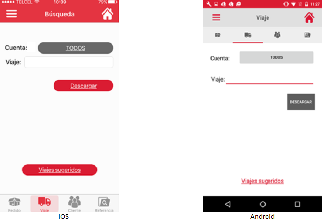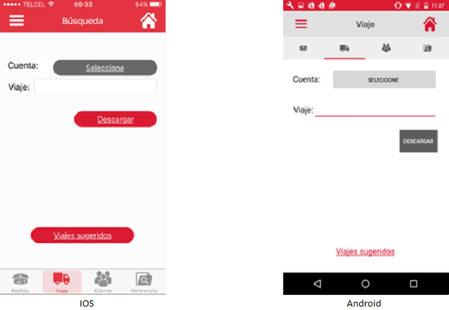 Para realizar una "Búsqueda por Viaje" el usuario deberá presionar el icono "Viaje" en la parte inferior izquierda de la pantalla y esta acción mostrará la siguiente pantalla que muestra el dato "Cuenta" cuyo valor es la última cuenta seleccionada en otro tipo de búsqueda: