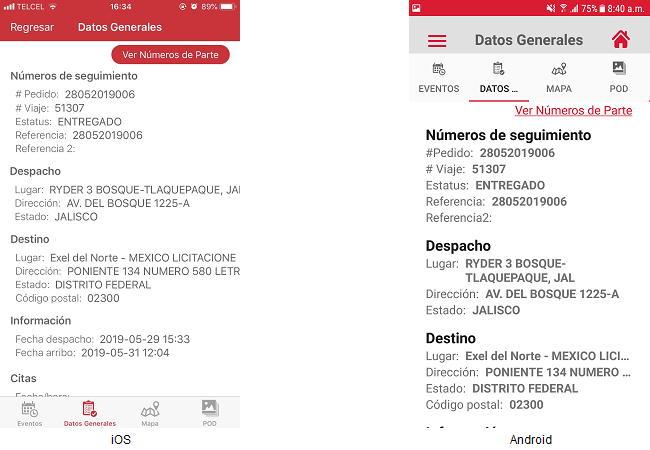 • El usuario deberá presionar el icono “+” del pedido de su interés y esta acción mostrará más información, se deberá presionar la opción “Ver Detalle” del viaje de su interés y esta acción mostrará la pantalla "Datos generales".