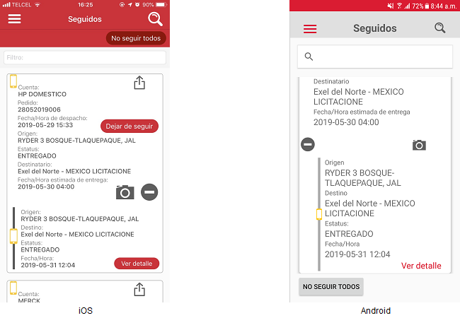 El usuario deberá estar posicionado en la pantalla donde se visualizan los datos de los pedidos como resultado de la búsqueda empleada o consultar la información de algún pedido en la pantalla “Seguidos”.