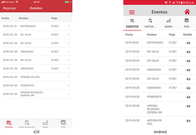 • El usuario deberá presionar el pedido de su interés y esta acción mostrará la pantalla Eventos, donde se mostrarán los eventos del pedido en orden descendente con base a la fecha.