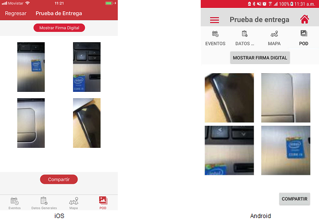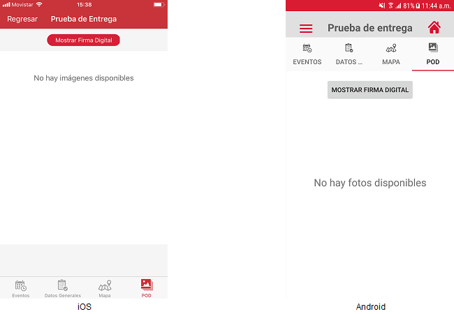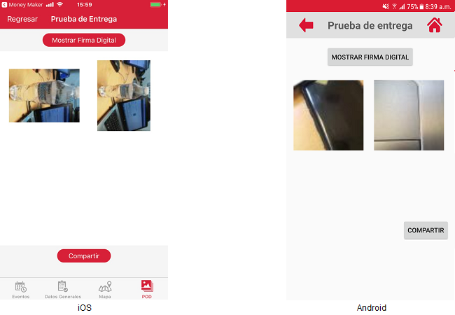 El usuario deberá presionar el botón [POD] y dicha acción mostrará la pantalla "Prueba de entrega“ mostrándose las imágenes de prueba de entrega y el botón “Visualizar Firma Digital”.