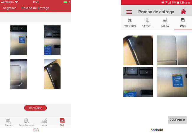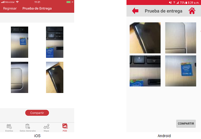 • El usuario deberá presionar el icono “Cámara” y esta acción mostrará el dialogo de descarga y posteriormente la pantalla "Prueba de entrega“ con las imágenes correspondientes. Si el usuario desea tener actualizadas las imágenes podrá actualizar dicha pantalla deslizándose hacia abajo, mostrándose las imágenes actualizadas.