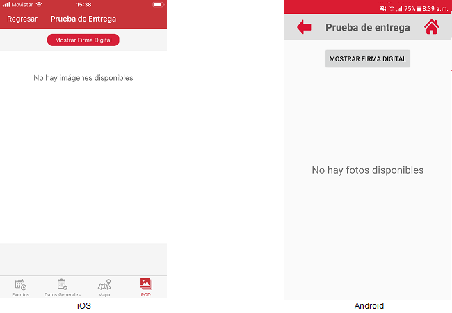 • El usuario deberá presionar el icono “Cámara” y esta acción mostrará el dialogo de descarga y posteriormente la pantalla "Prueba de entrega". Se visualiza la pantalla con el mensaje “No hay fotos disponibles ” y el botón “Mostrar Firma Digital”.