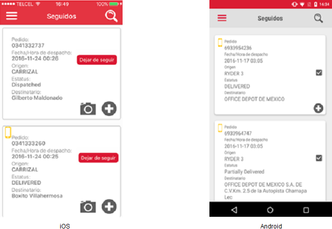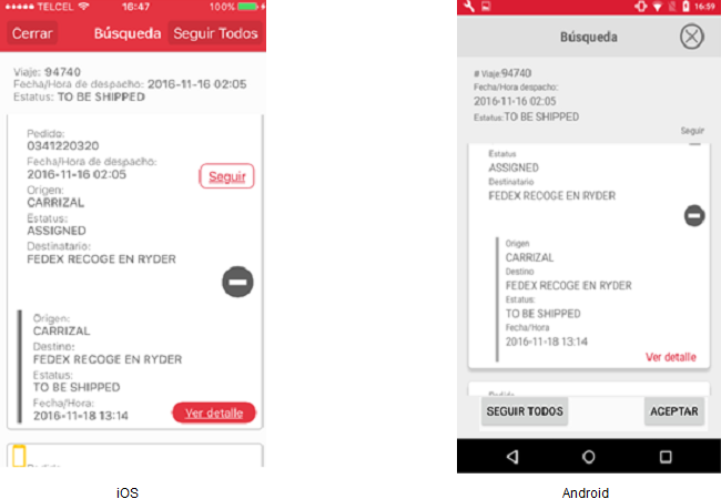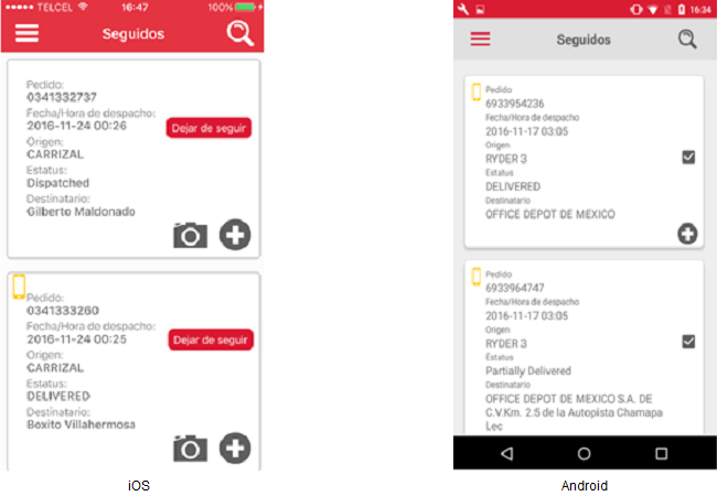 • Si el usuario sigue a un pedido, se mostrará la pantalla "Seguidos" ubicado en el pedido consultado.