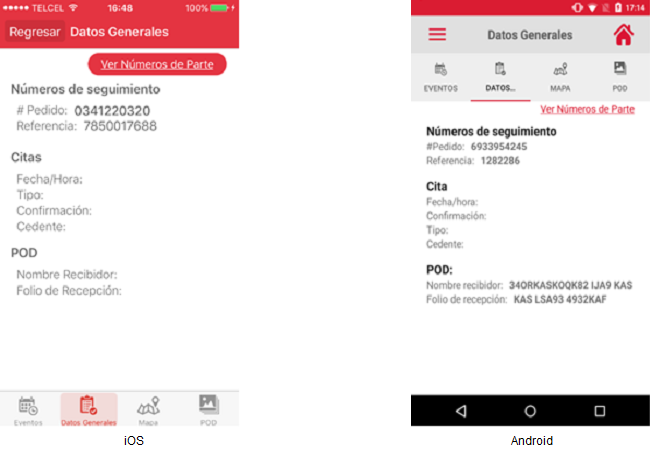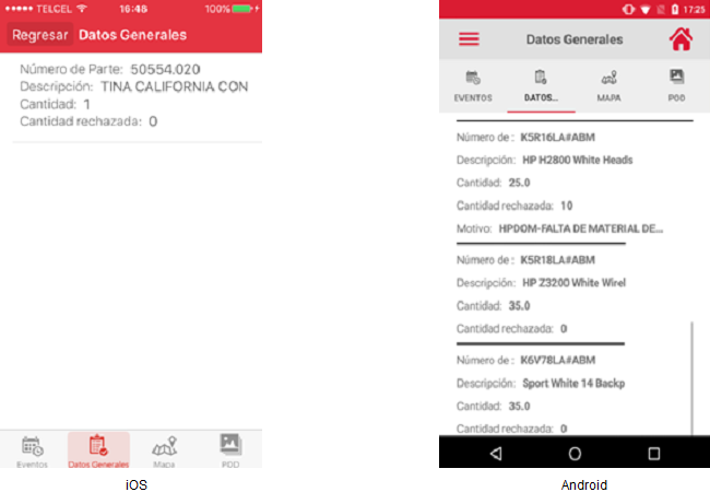 La aplicación le mostrará al usuario la pantalla donde comienza avisualizarse la información por número de parte correspondiente al pedido dentro de los datos generales.